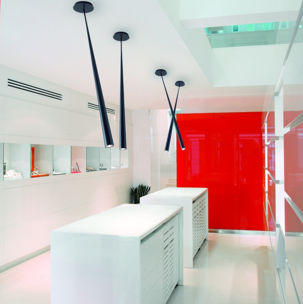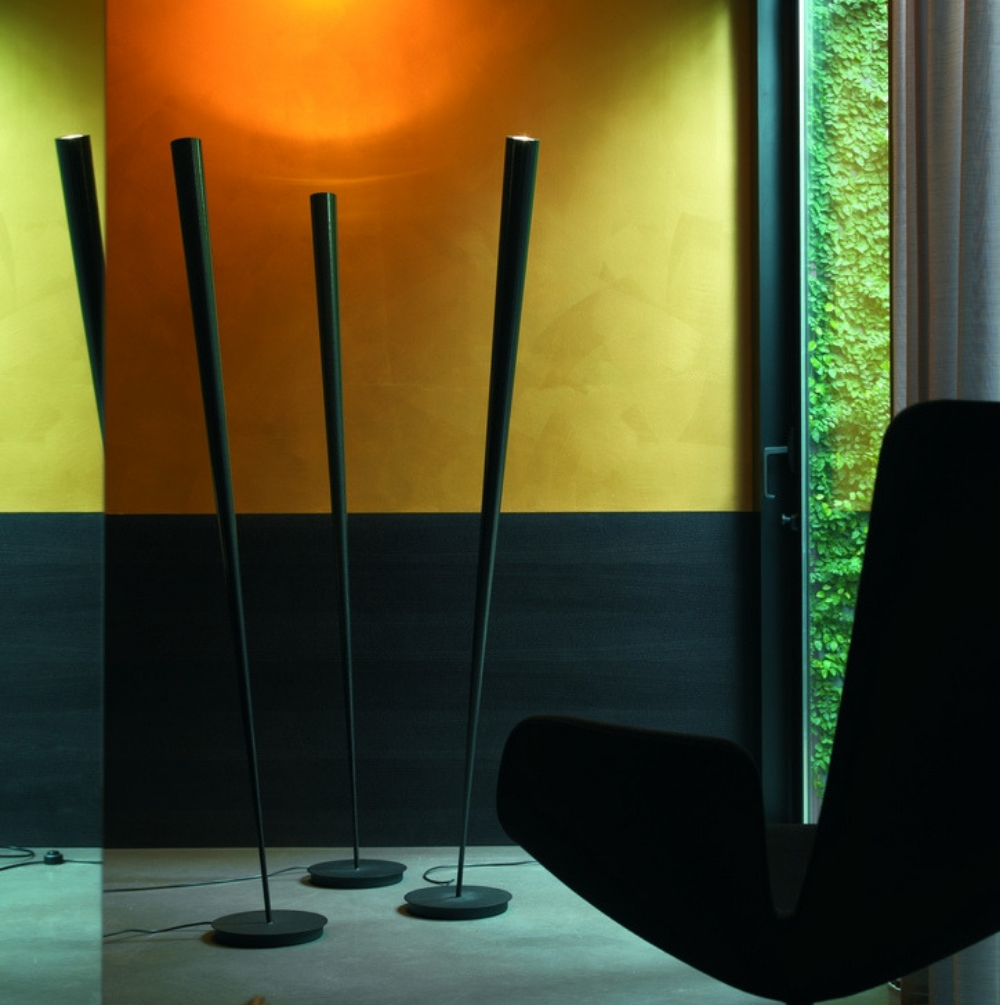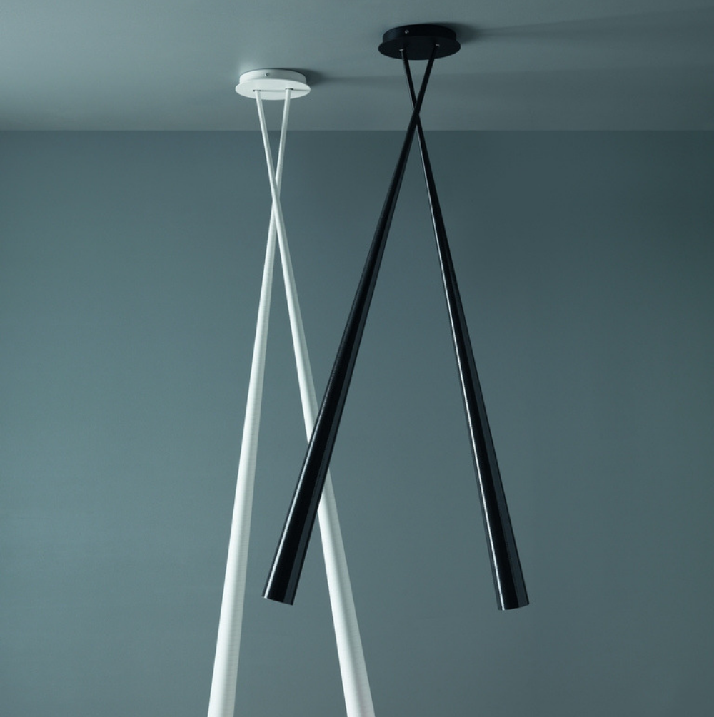 Una colección compuesta por lámparas de suelo, techo y suspendidas en fibra de carbono negra con base metálica pintada de negro o en fibra de vidrio pintada, pivotantes hasta 360 ° y con un ángulo de inclinación de 15 °. La versión suspendida está disponible en uno o dos conos con tres longitudes diferentes de 63 cm, 127 cm y 175 cm.