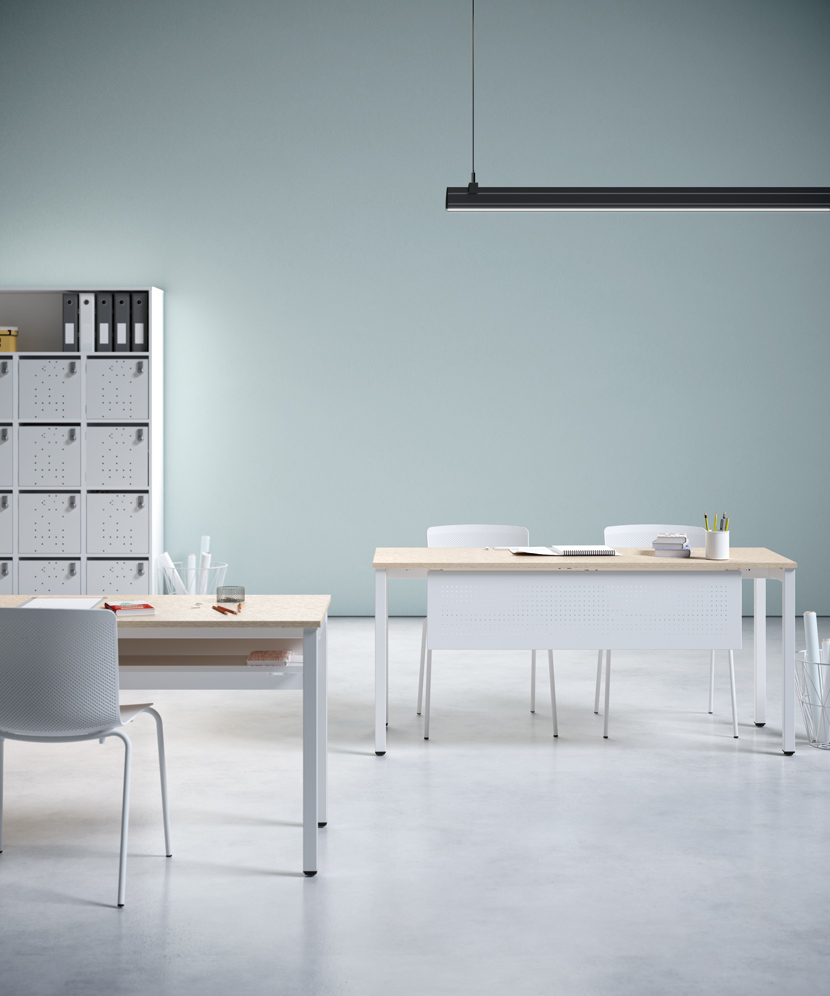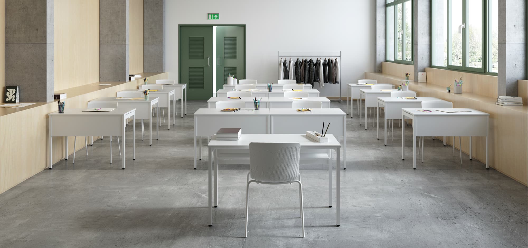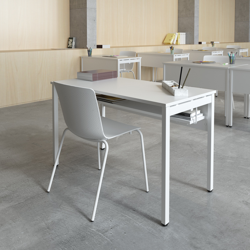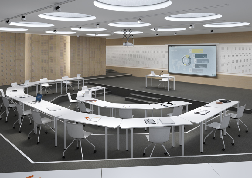 Class se postula como la mesa de colectividades y espacios de formación en entornos educacionales y laborales. Sus soluciones han sido desarrolladas para responder a las necesidades de espacios como aulas, salas de training o de prensa y zonas de conferencia o multiuso. Las configuraciones clásicas en las salas de formación y training se solucionan con Class de una forma sencilla gracias a las mesas de diferentes anchos y siempre de fondo 60 cm para optimizar los espacios. Su pórtico en forma de “U” invertida otorga ese plus de diseño actual a los espacios hasta ahora solucionados con productos donde la estética no jugaba un valor importante.