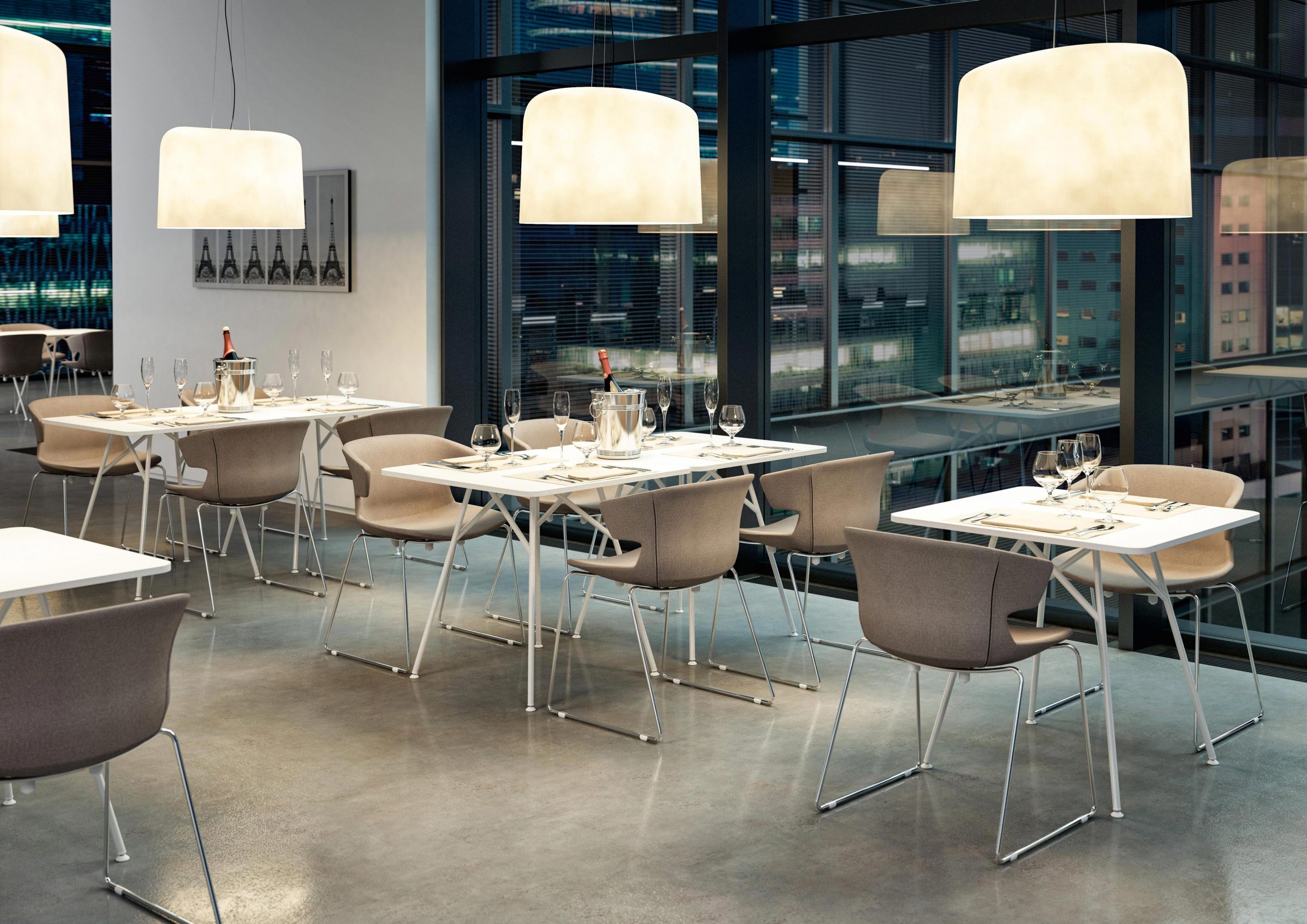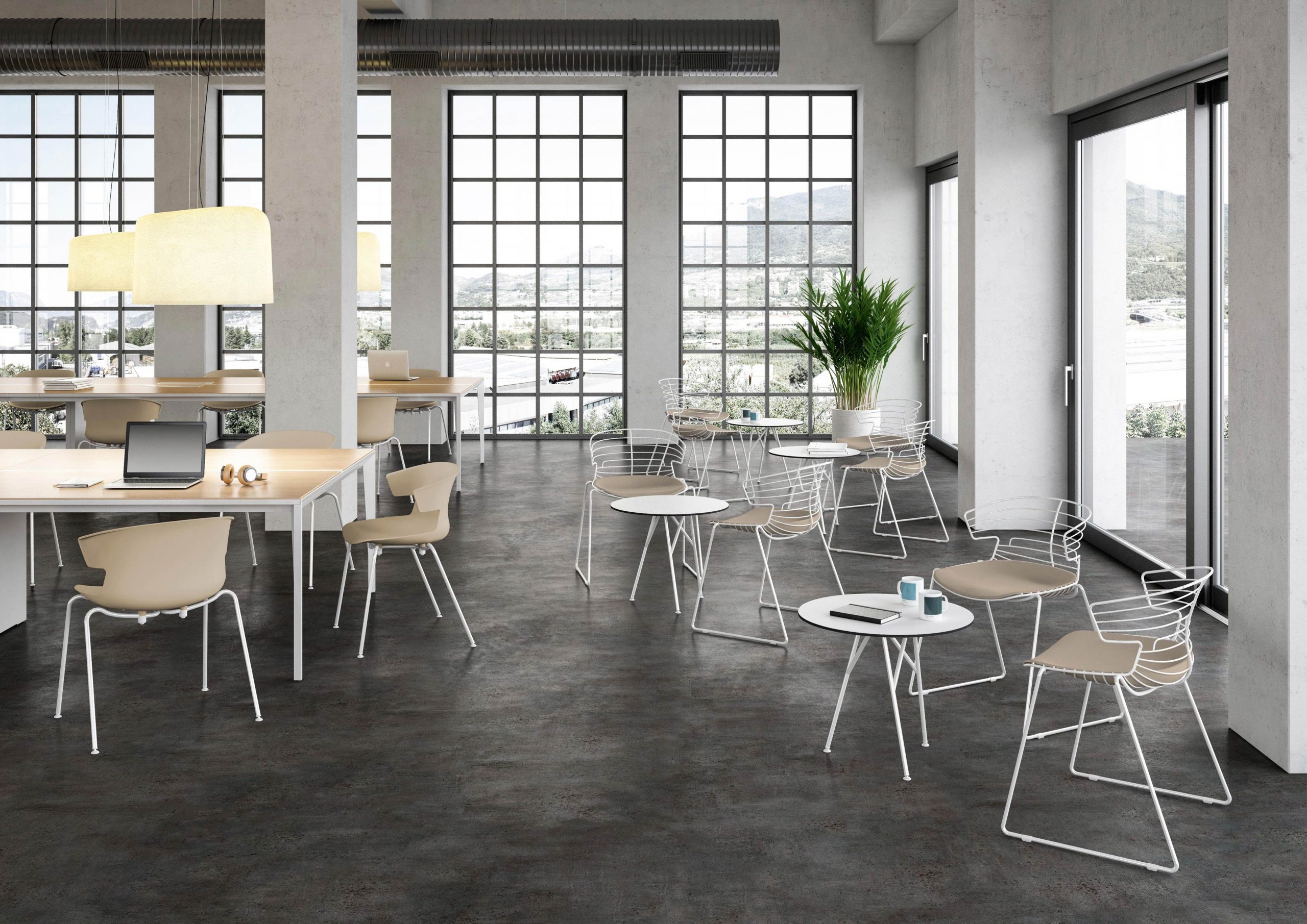 Mesa y mesitas con estructura en acero y en madera de distintas dimensiones y formas completan la oferta de la gama. La opción carcasa tapizada y patas de madera a juego con la mesa de la misma línea generan valor añadido en el amueblamiento.