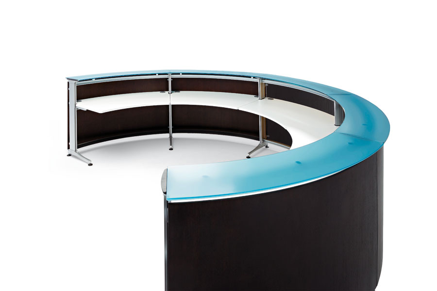Un mostrador con carácter versátil. Unos mismos módulos permiten realizar múltiples configuraciones de distintas formas y adaptar cada recepción al entorno La utilización de una amplia variedad de acabados como chapa perforada, madera, metacrilato o vidrio, permite múltiples combinaciones para obtener una recepción cualitativa y original.