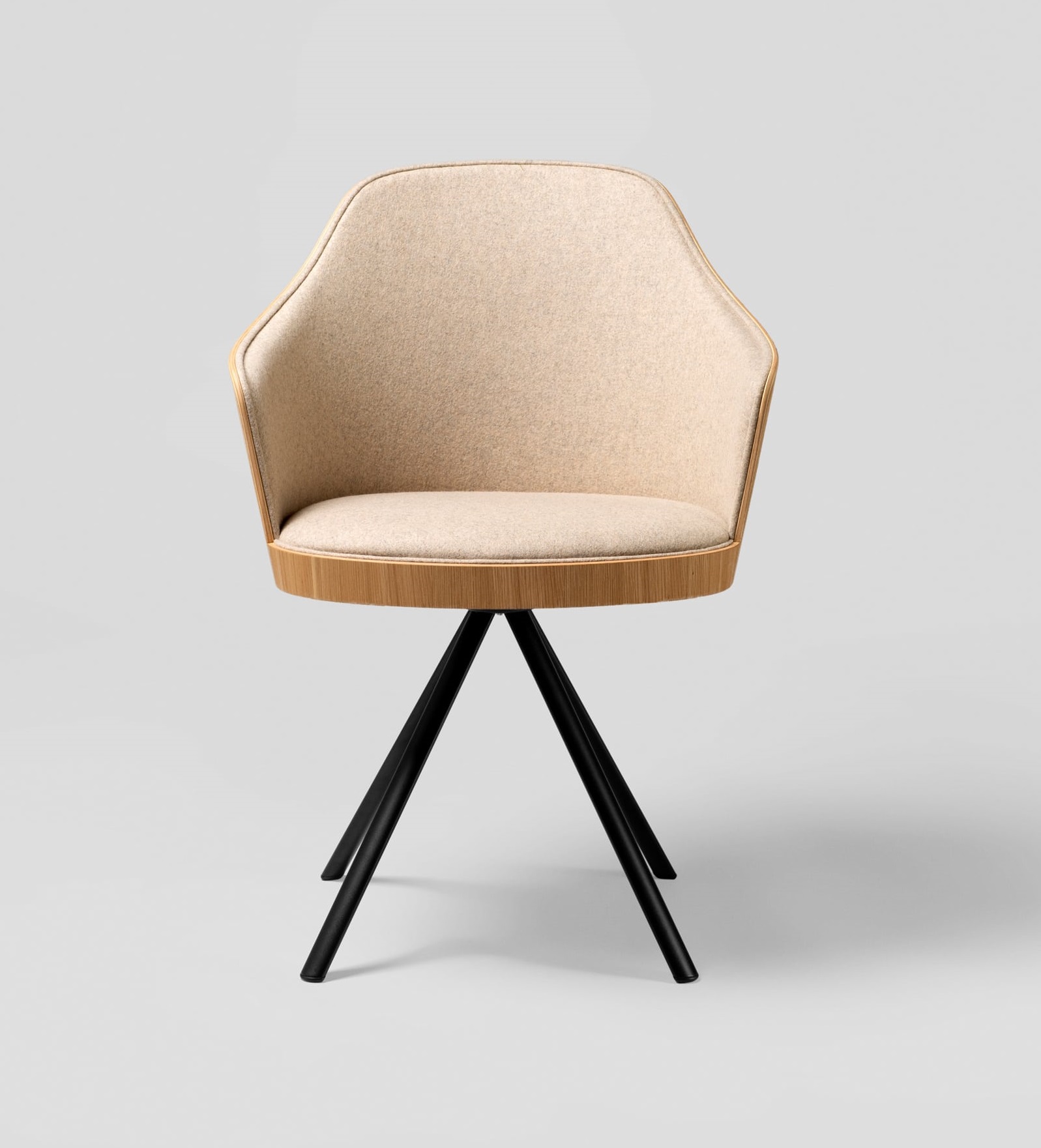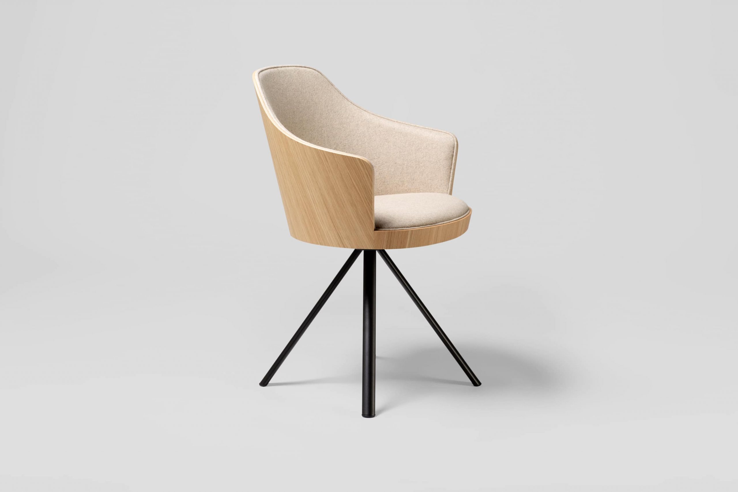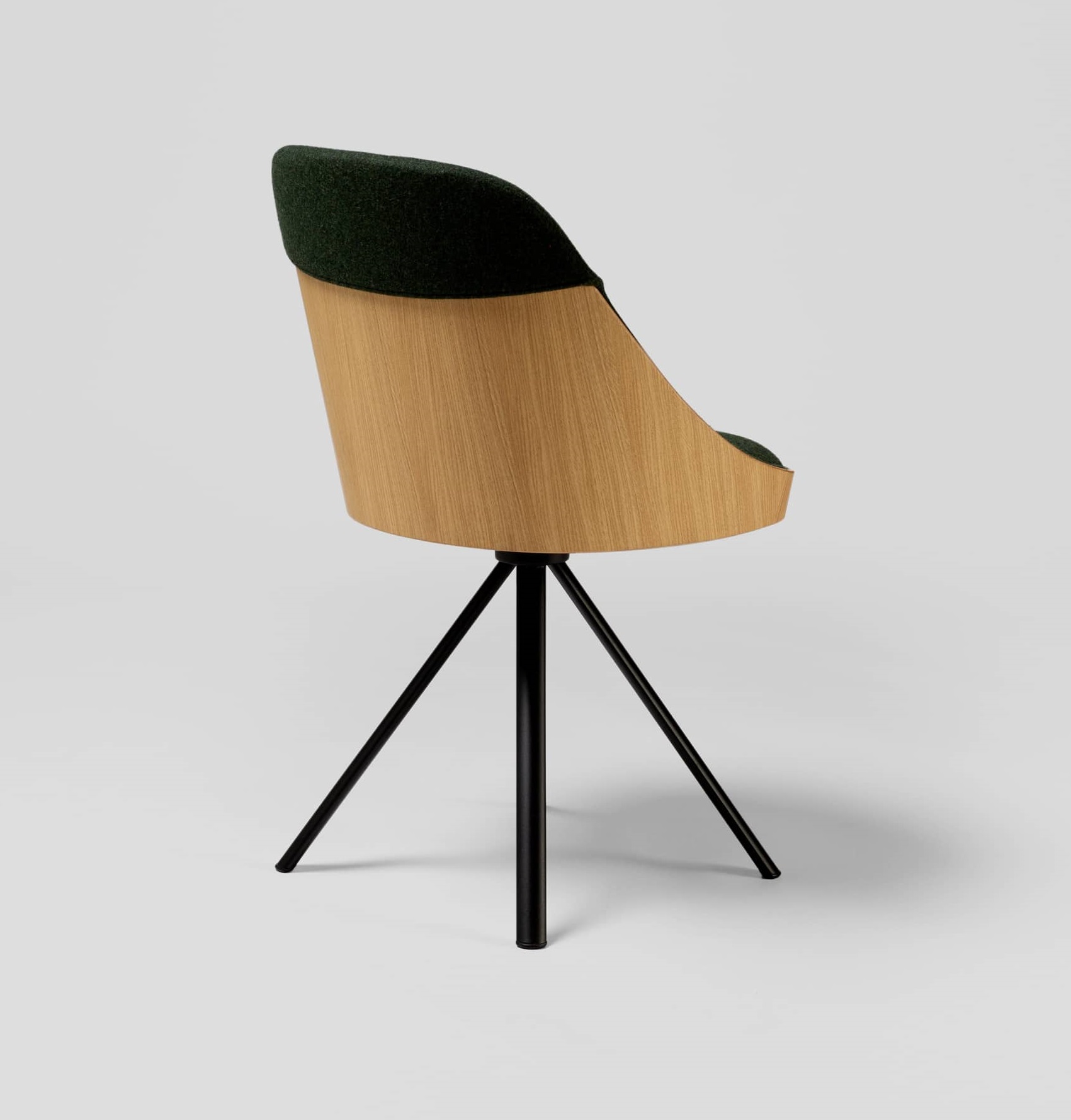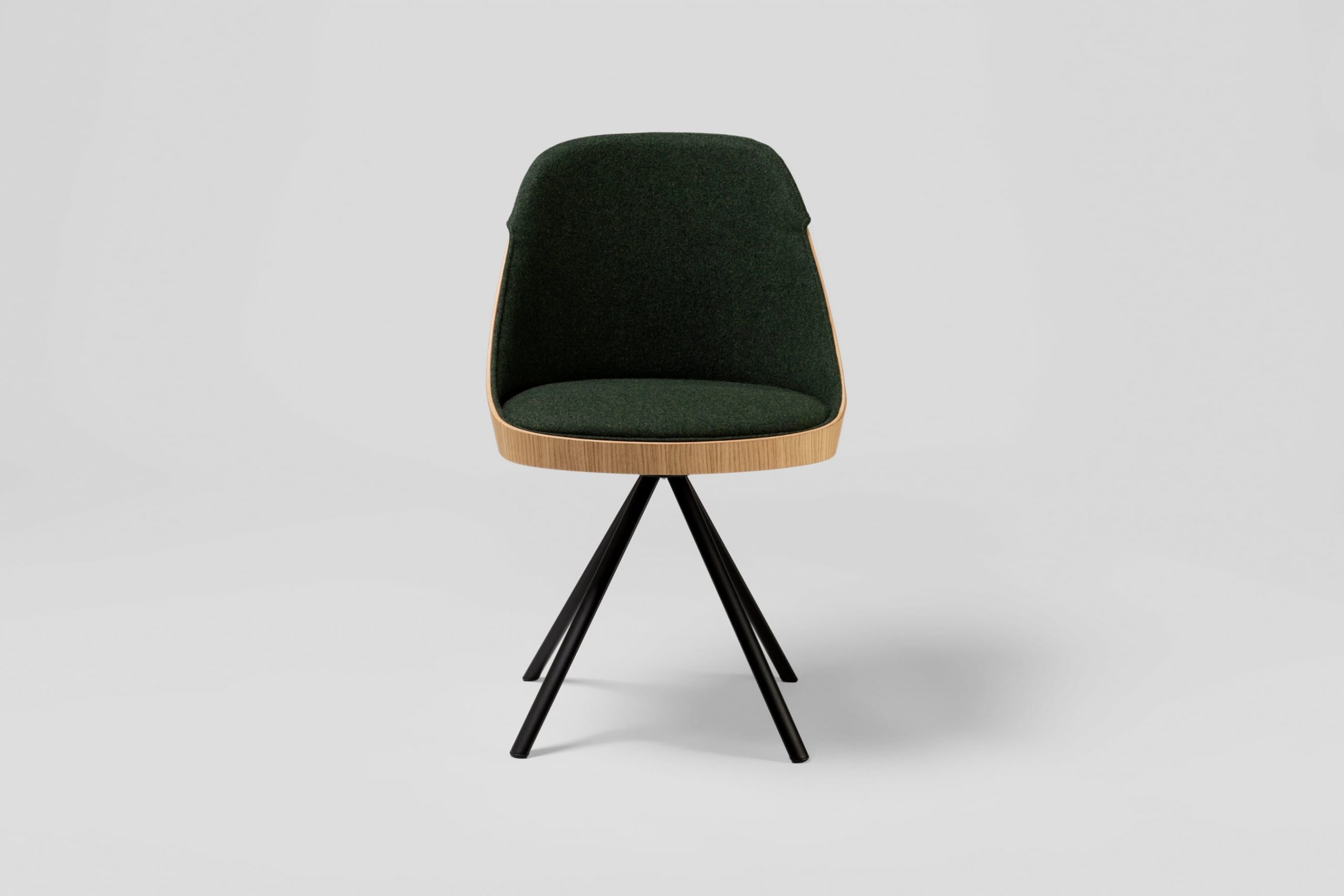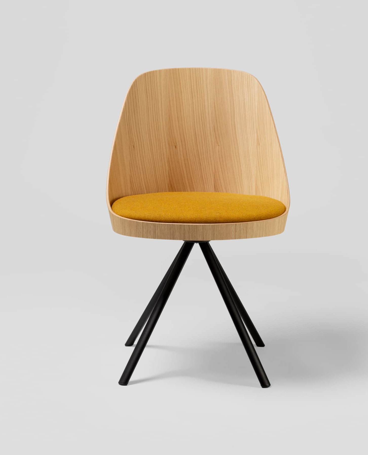 La silla Kaiak spin, disponible con y sin brazos, tiene una carcasa de madera de roble natural o tintado y cuenta con una gran variedad de opciones de tapicería: totalmente tapizada, solo el asiento tapizado, tapizado tres cuartos y tapizado frontal. Gracias a su estructura de 4 patas de acero lacado, la silla puede ser giratoria o fija.