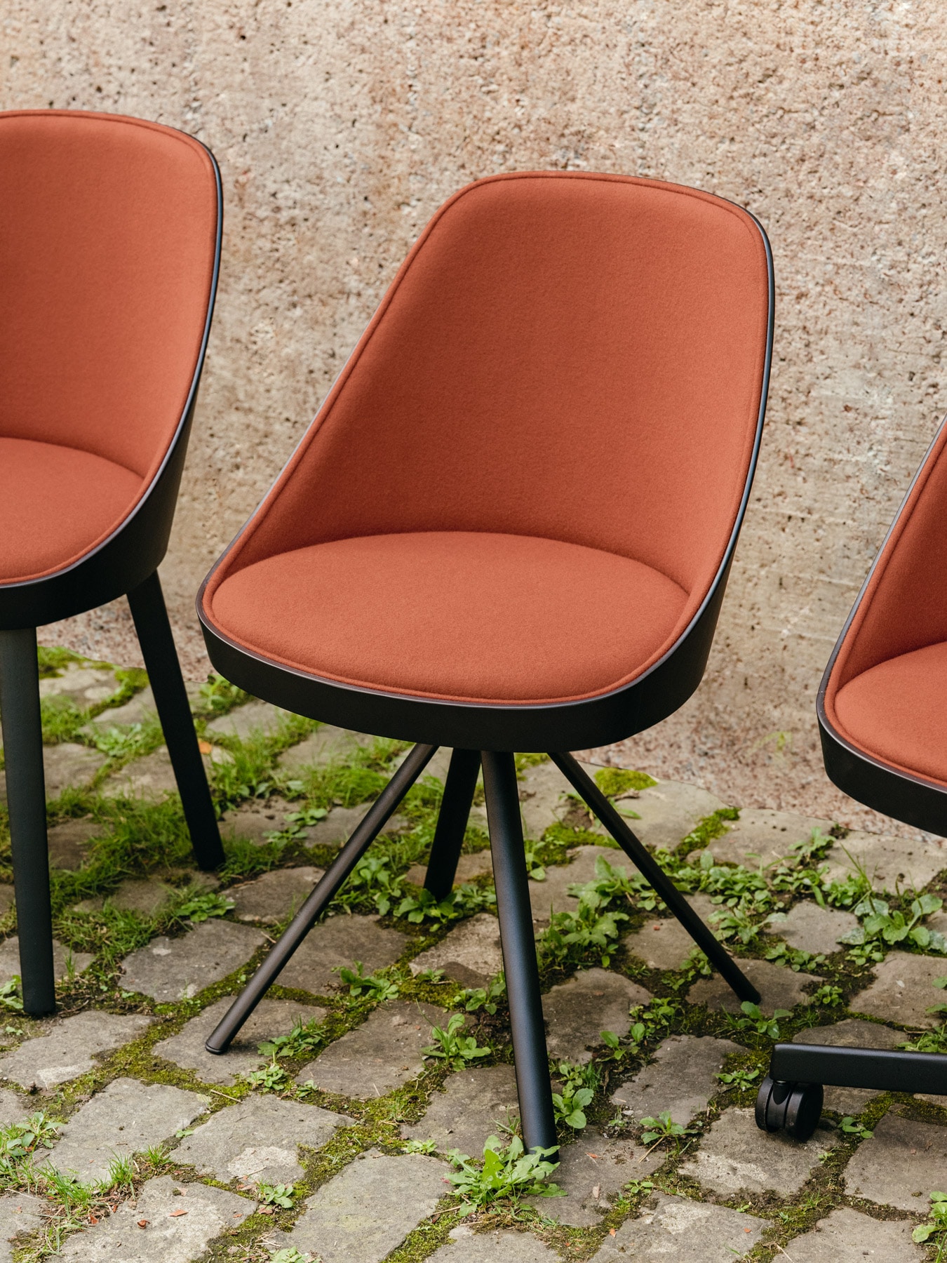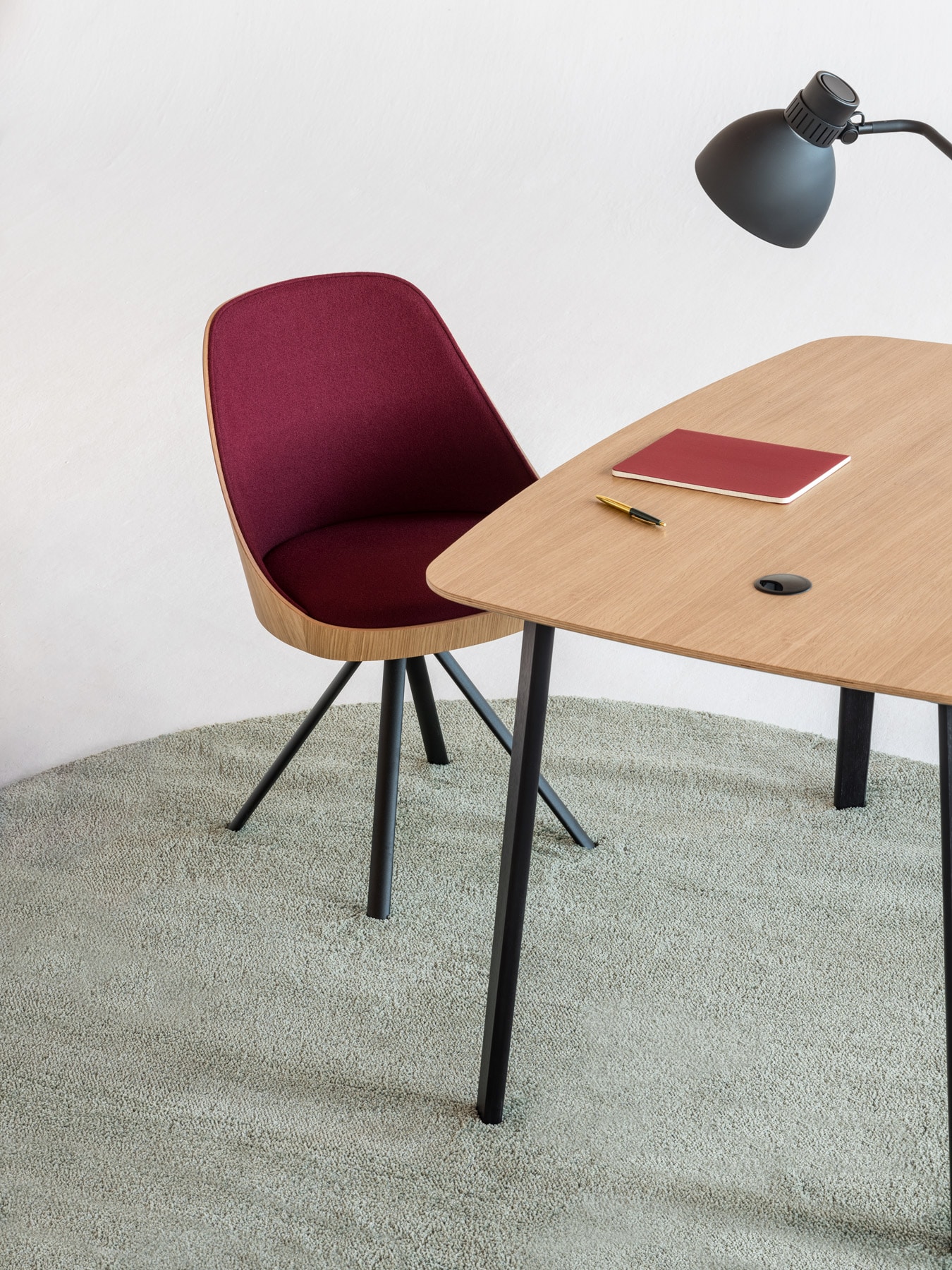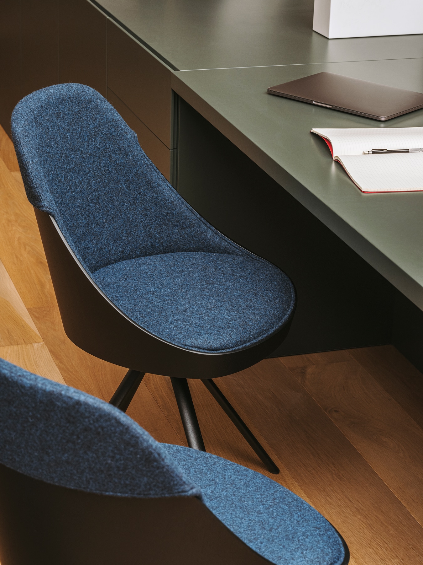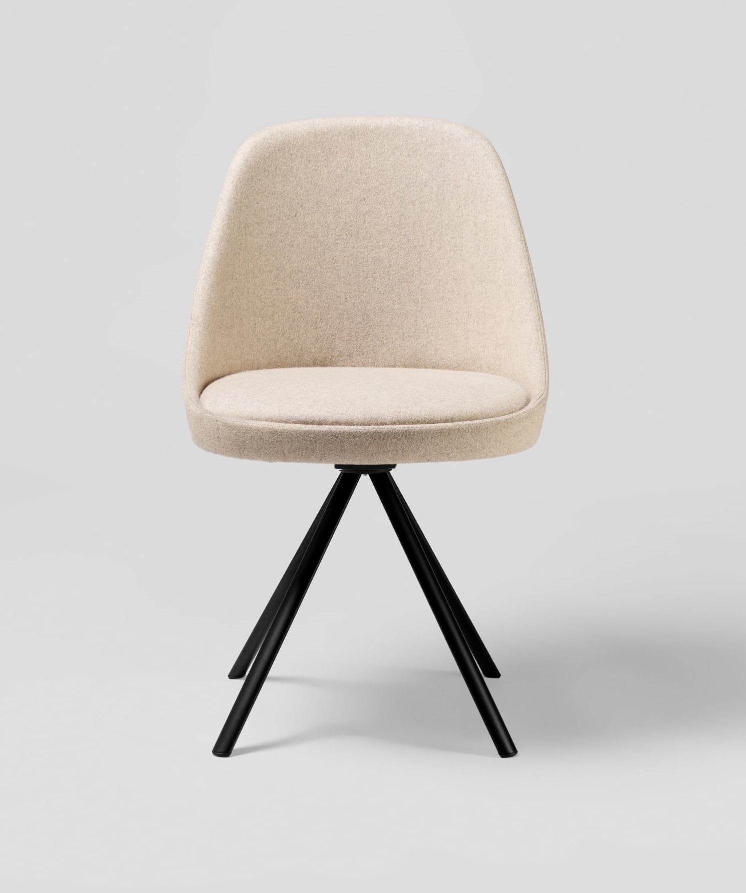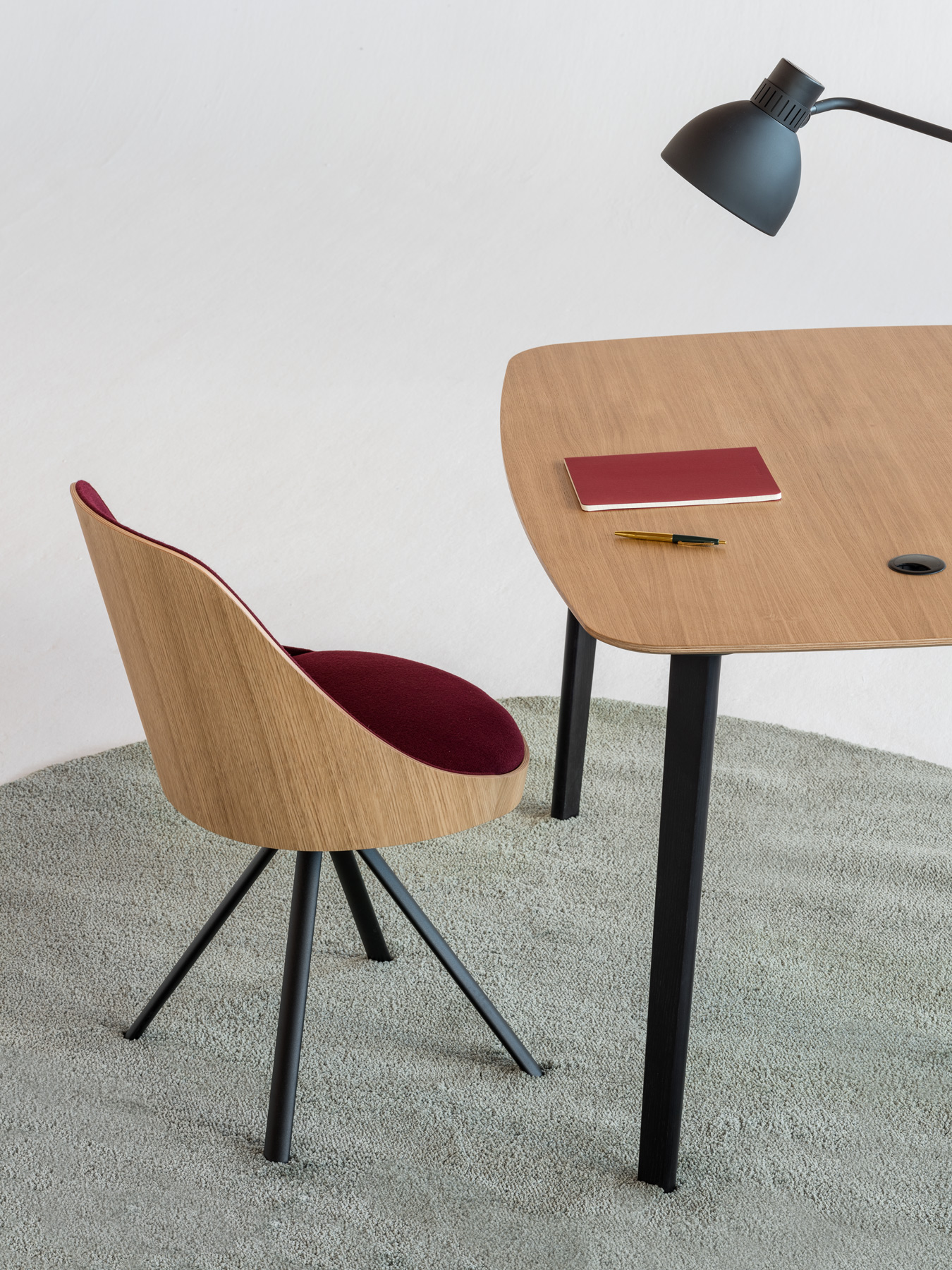 La silla Kaiak spin, disponible con y sin brazos, tiene una carcasa de madera de roble natural o tintado y cuenta con una gran variedad de opciones de tapicería: totalmente tapizada, solo el asiento tapizado, tapizado tres cuartos y tapizado frontal. Gracias a su estructura de 4 patas de acero lacado, la silla puede ser giratoria o fija.