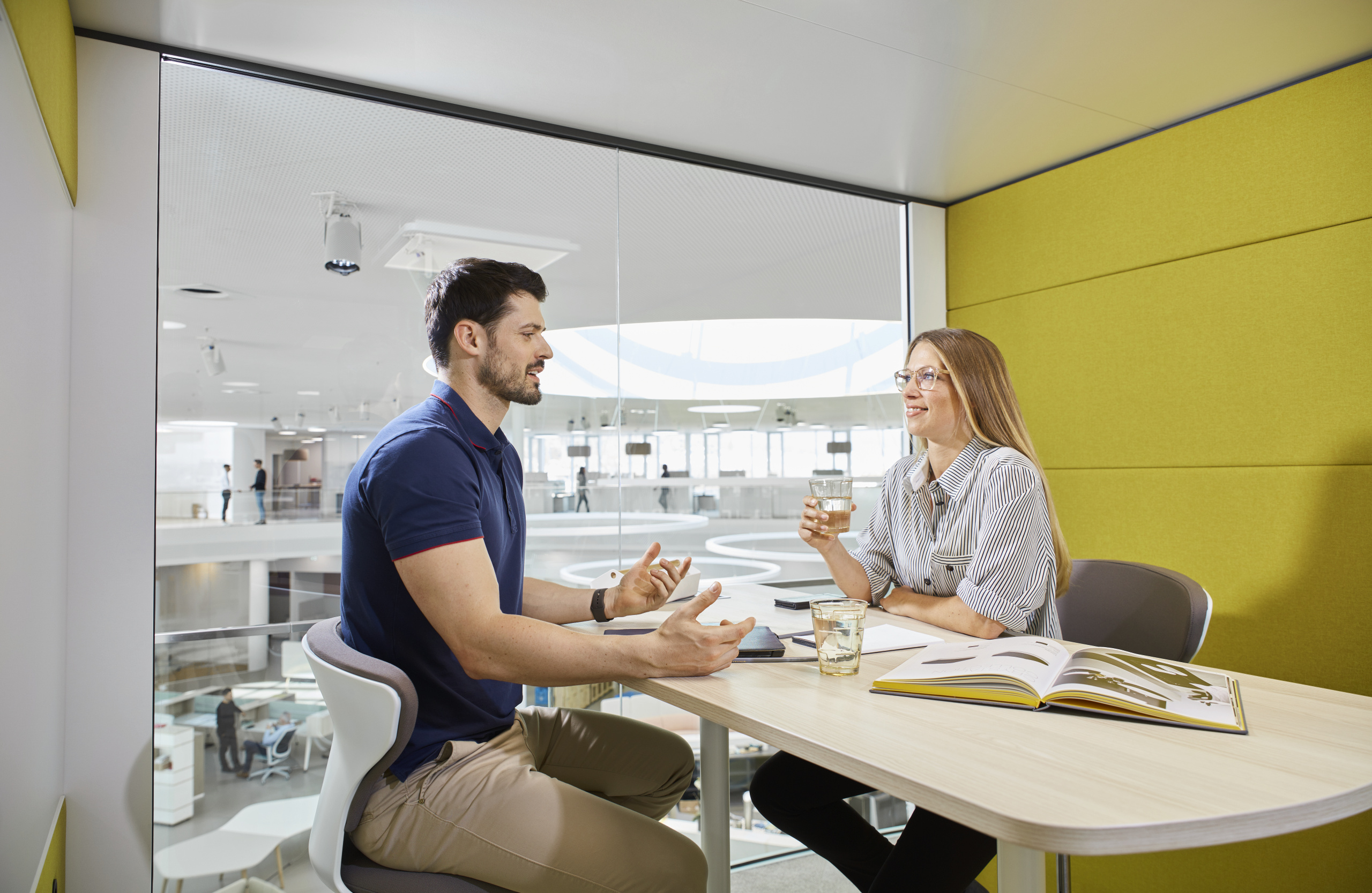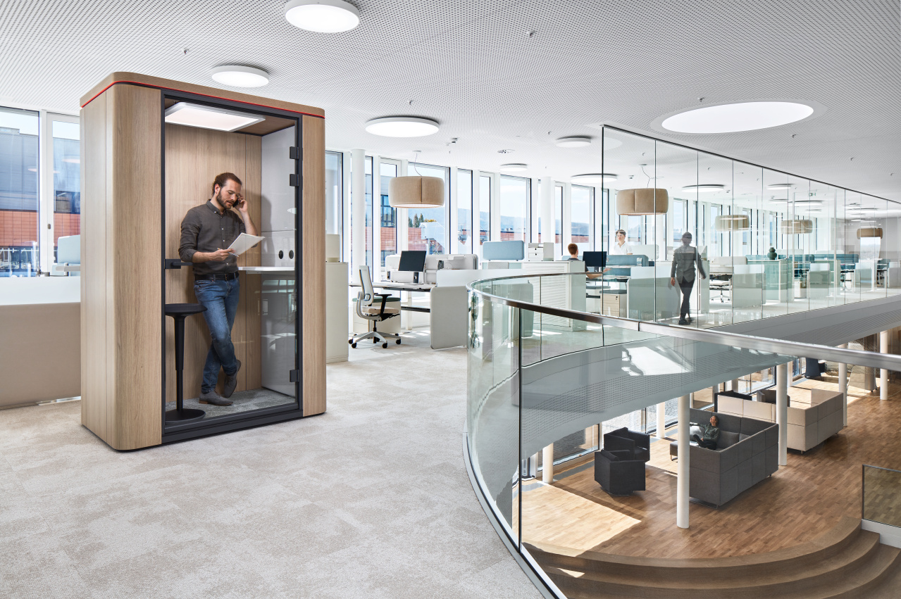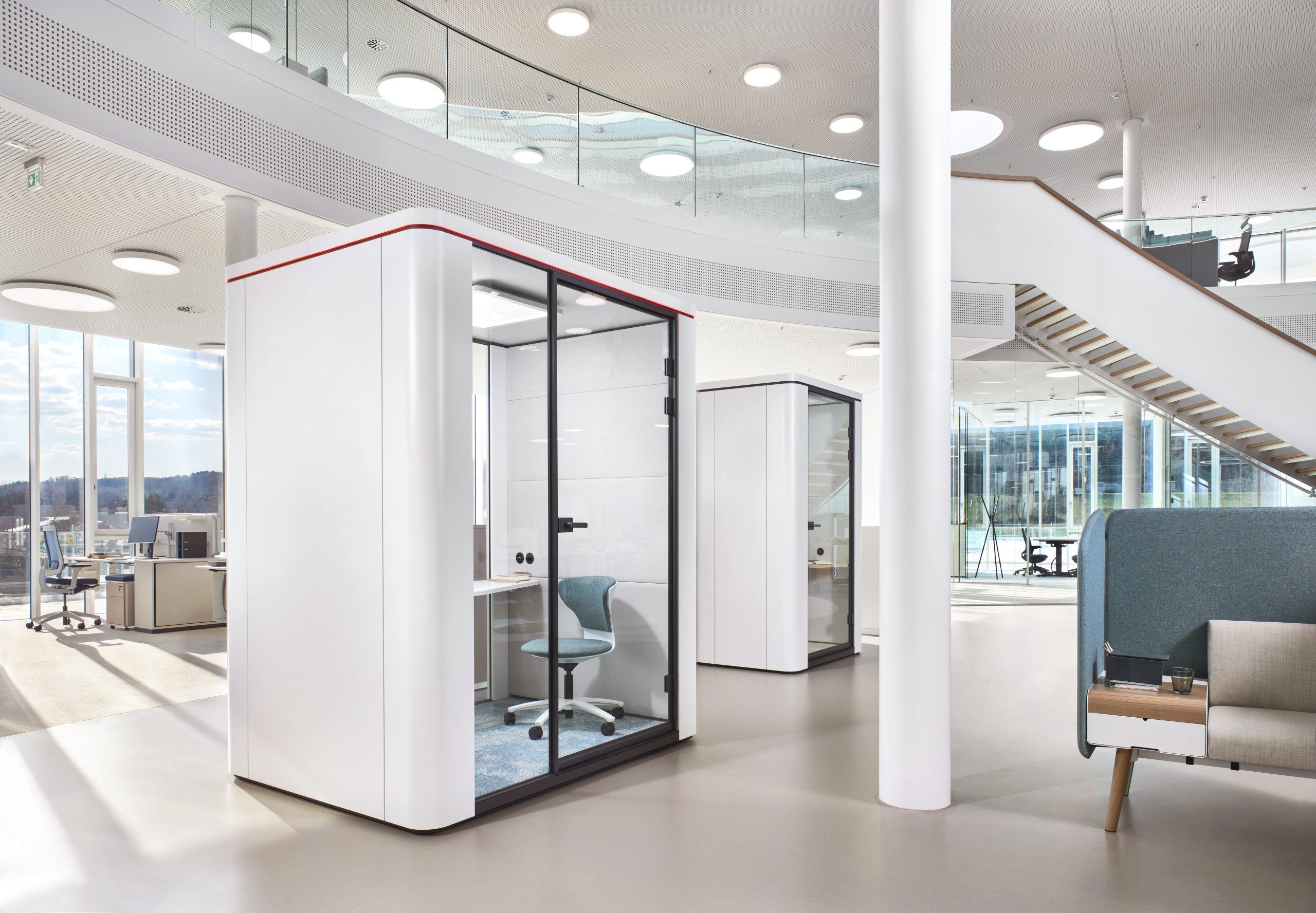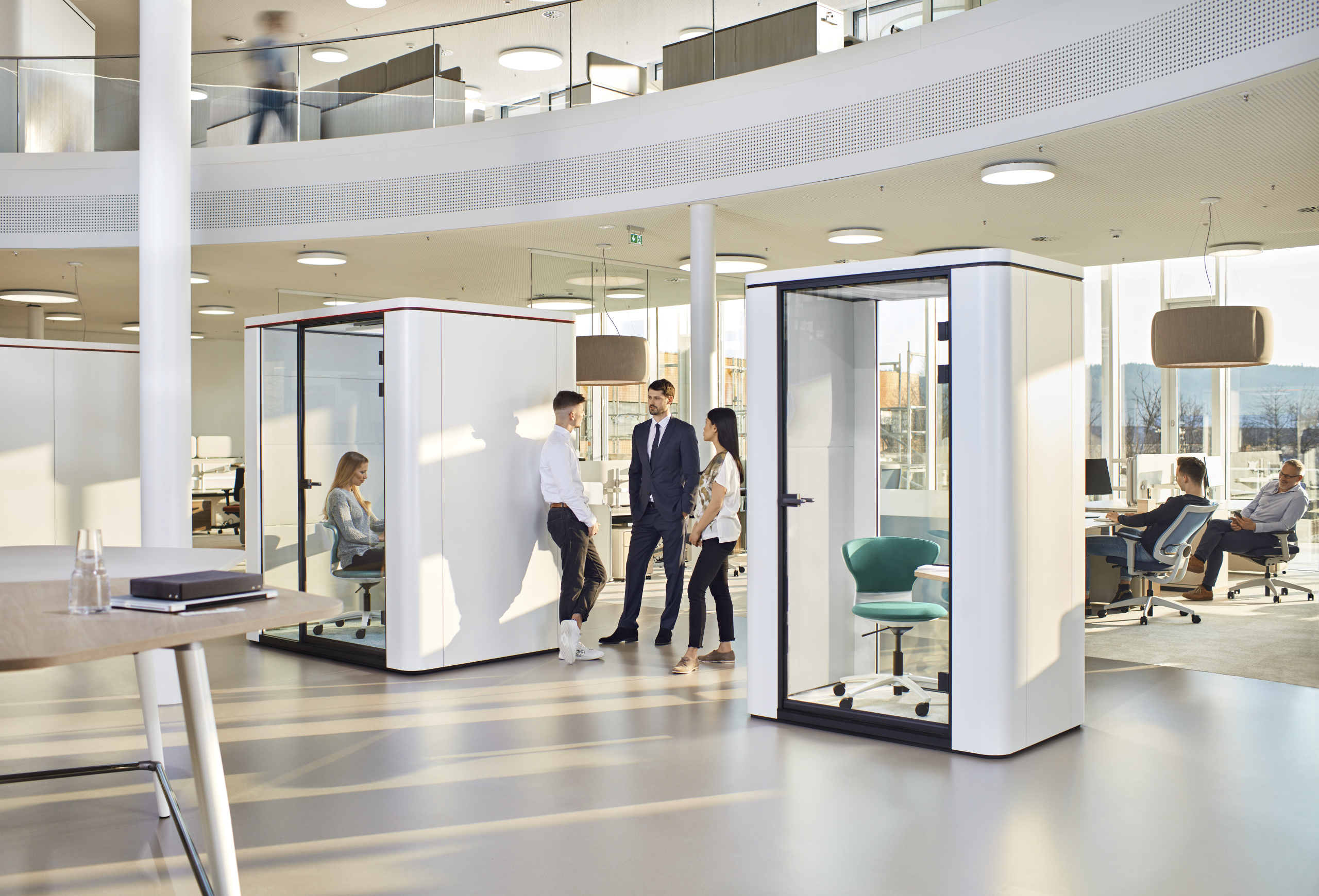 Módulos «room in room» cerrados y flexibles. Los «Open Space» y las oficinas diáfanas resultan idóneos para optimizar la eficiencia del espacio. Pero, ¿qué sucede con el trabajo concentrado? Para ello se necesita un espacio que Sedus se:cube es capaz de ofrecer en un abrir y cerrar de ojos. El nuevo cubículo de oficina de Sedus marca la pauta en términos de montaje, acústica y ambientación y ofrece espacio para hasta ocho personas, ya sea para retirarse a reflexionar, para celebrar reuniones o para relajarse.