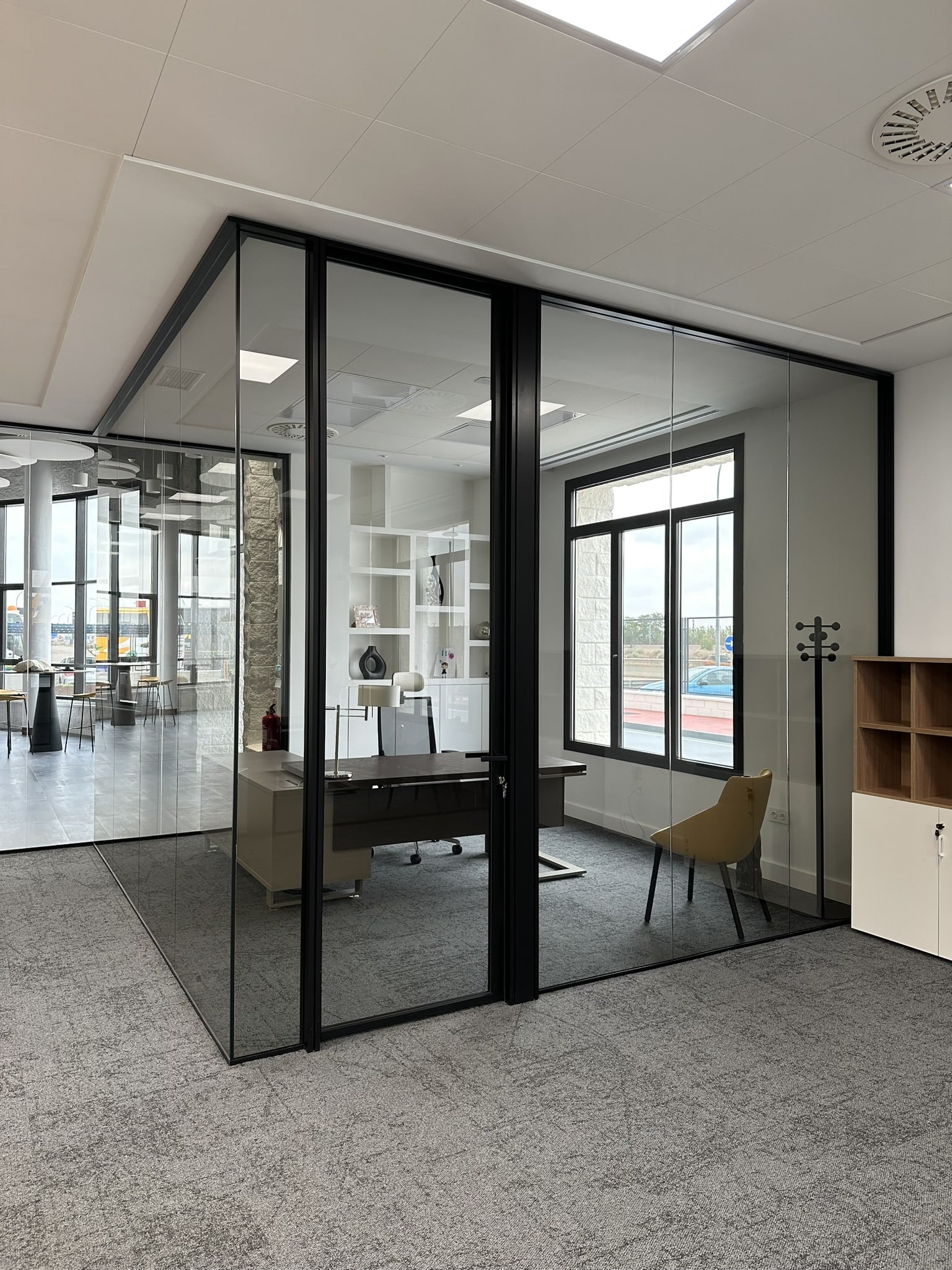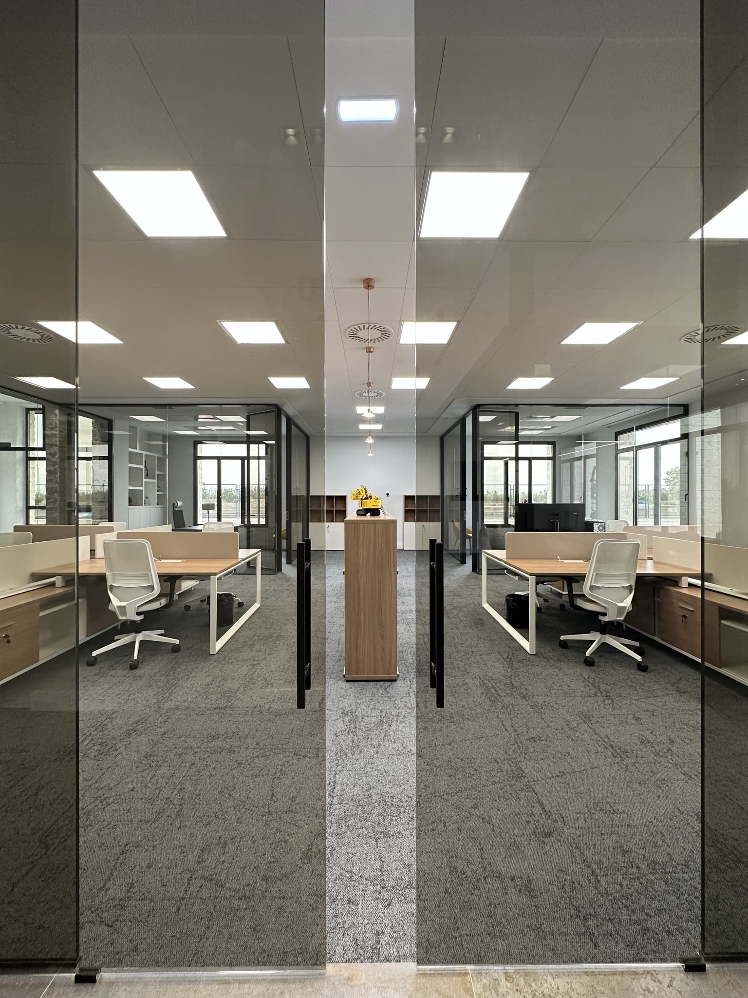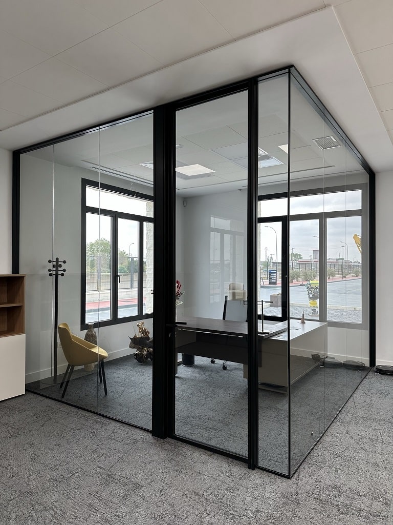 Para este acondicionamiento se ha optado por un mobiliario de calidad Actiu y Andreu World, con acabados cálidos en color madera, sillería de nuestro fabricante Forma 5, y un acondicionamiento acústico y visual en la compartimentación de espacios y revestimientos de suelos con vidrios en color fume azul para la mampara Trebe de Sitab y la moqueta de Interface.