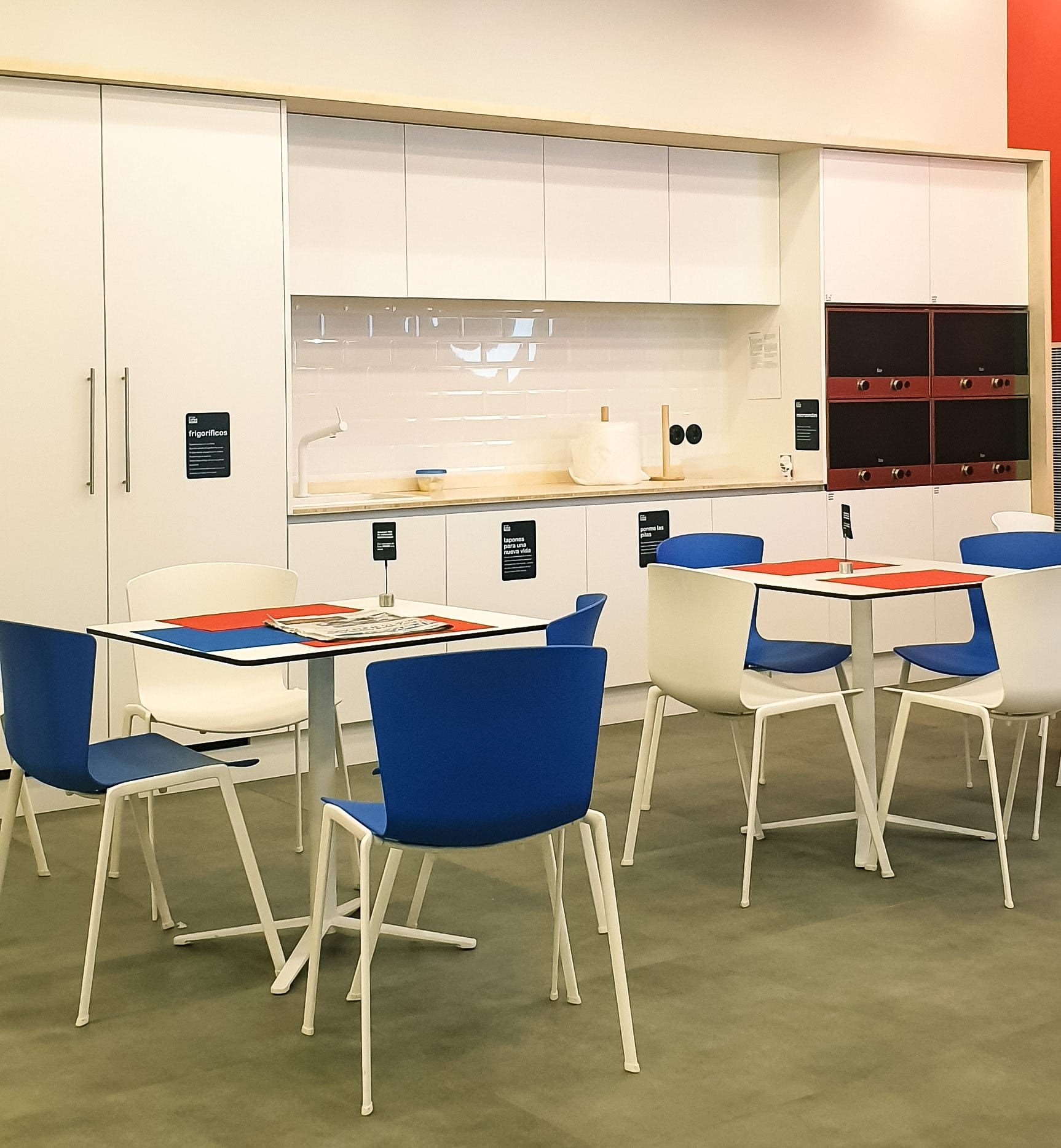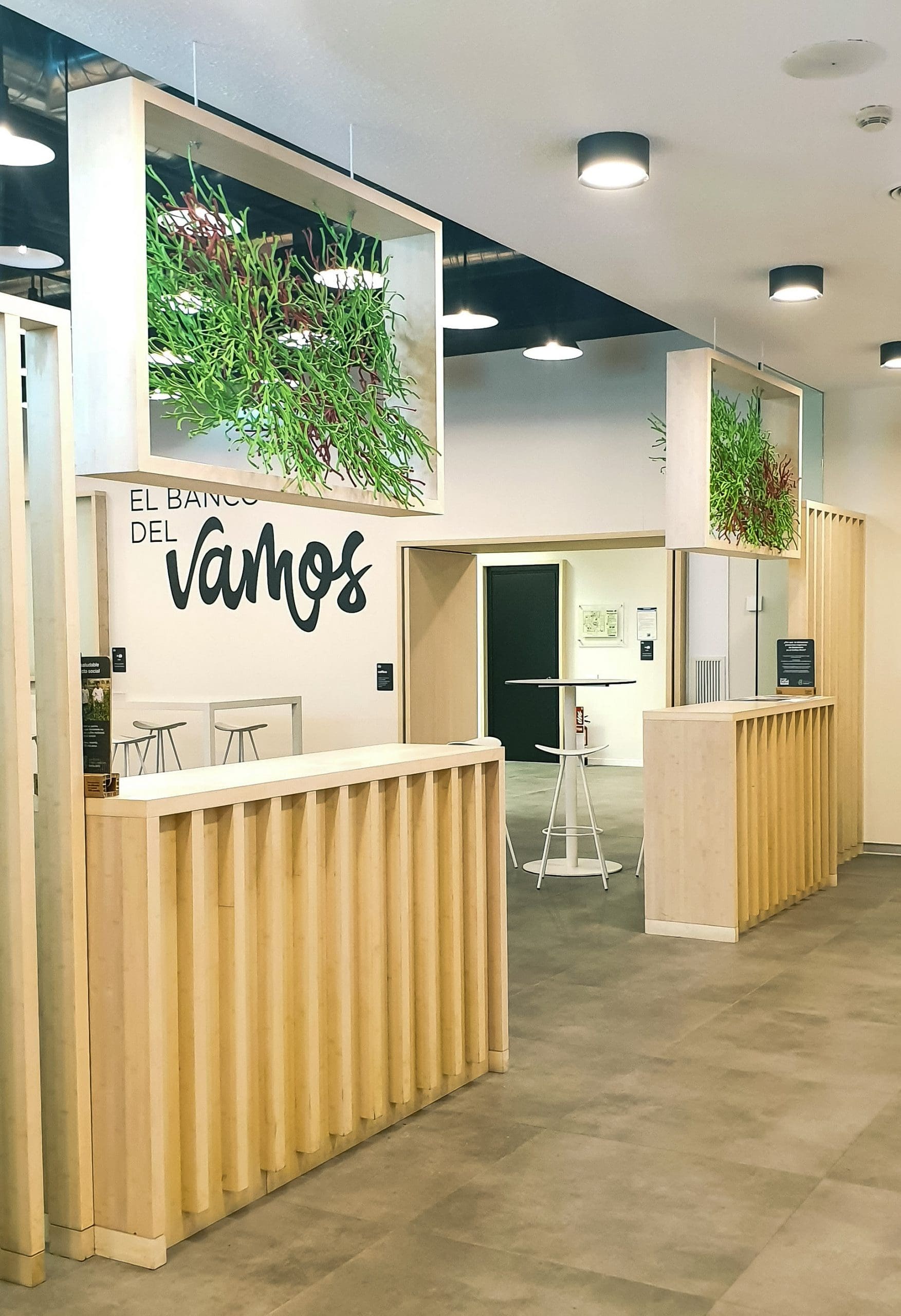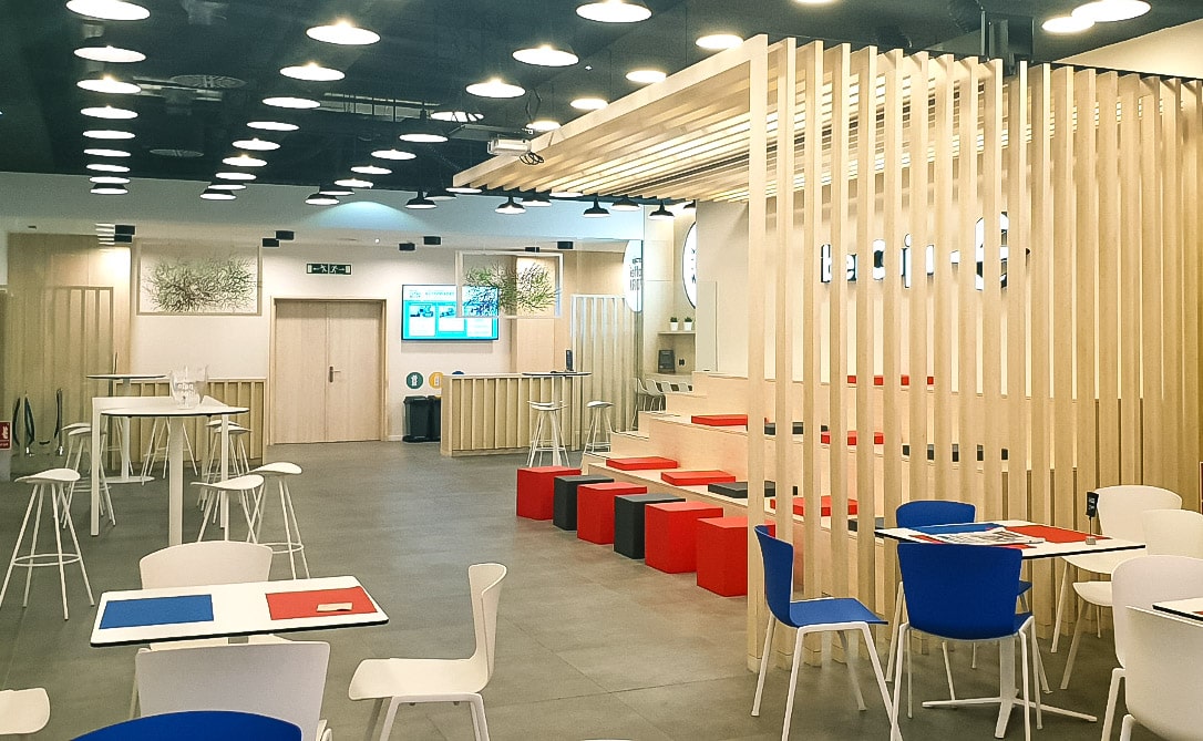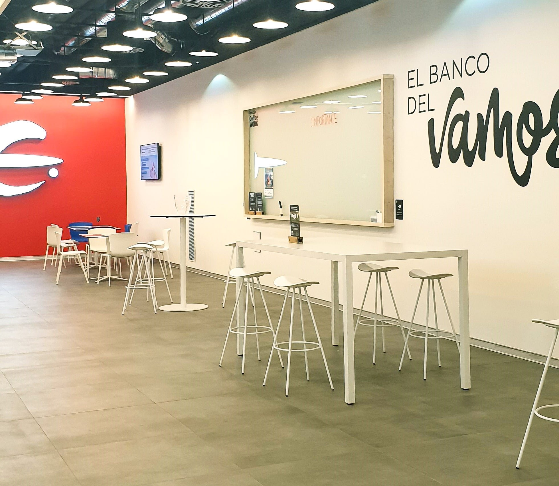 Se han creado varias zonas de reunión en mesas altas, unas zonas de consulta de prensa o para conectividad de aparatos electronicos como tablets y ordenadores, y una zona con un office para retomar fuerzas.